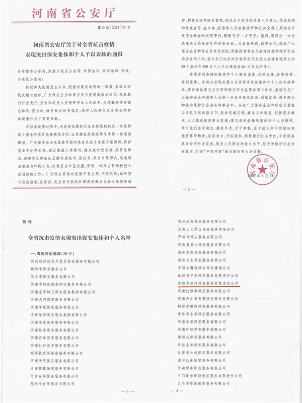 為表?yè)P(yáng)先進(jìn)、鼓舞士氣,鼓勵(lì)廣大保安企業(yè)和保安員爭(zhēng)先創(chuàng)優(yōu),積極投身常態(tài)化疫情防控和維護(hù)社會(huì)治安各項(xiàng)工作,公安部公傳發(fā)【2020】276號(hào)、河南省公安廳豫公治【2021】45號(hào)文件,通報(bào)表?yè)P(yáng)保安行業(yè)抗擊疫情表現(xiàn)突出集體和個(gè)人。其中安陽(yáng)市洹河保安服務(wù)有限責(zé)任公司榮獲“全省抗擊疫情表現(xiàn)突出集體”;公司黨委書(shū)記、董事長(zhǎng)、總經(jīng)理王高峰榮獲“全國(guó)抗擊疫情表現(xiàn)突出個(gè)人”榮譽(yù)稱(chēng)號(hào)。
