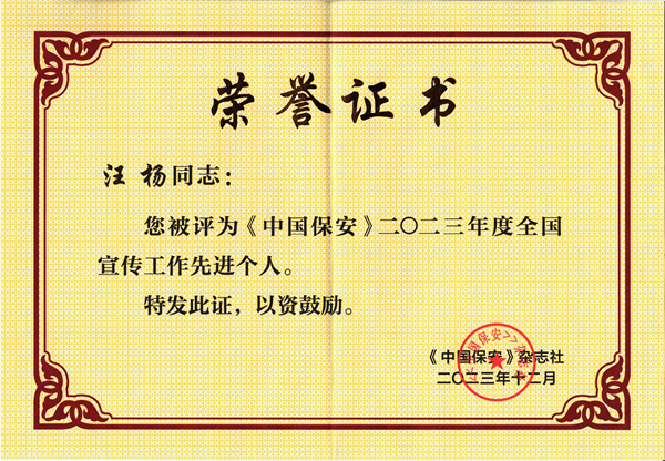 2023年12月,《中國保安》雜志對2023年度全國保安行業(yè)宣傳工作成績突出的集體和個人進(jìn)行了表彰,公司綜合辦公室汪楊同志榮獲“2023年度全國宣傳工作先進(jìn)個人”稱號。