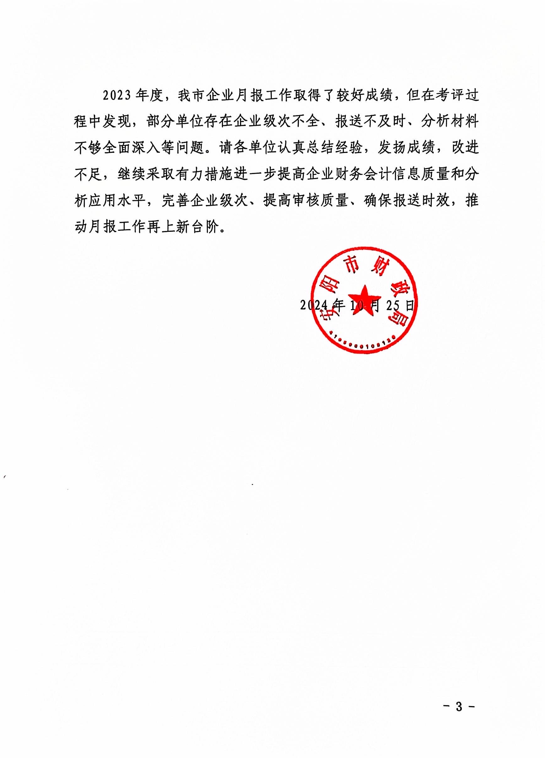 10月25日,安陽市財政局印發(fā)《關(guān)于2023年度企業(yè)經(jīng)濟效益月報工作的通報》(安財企〔2024〕5號),經(jīng)安陽市財政局綜合考評,洹河保安公司2023年度經(jīng)濟效益月報工作及財務部副主任張鵬霞同志,被通報表揚。