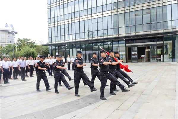 這隊(duì)特保隊(duì)員是人防一大隊(duì)駐聯(lián)通公司中隊(duì)特保隊(duì)員。只見4名標(biāo)兵著裝整齊,正步走向預(yù)定位置;3名護(hù)旗手在6名隊(duì)員護(hù)送下步伐整齊的走向升旗臺。護(hù)旗手上臺掛旗動作嫻熟,伴隨著高昂的國歌,五星紅旗冉冉升起,全體參與人員向國旗敬禮。此刻,上升的不僅有國旗,還有全體黨員干部職工對黨和國家的熱愛和自豪感、愛國愛黨情懷。