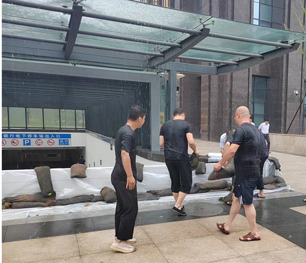 7月5日13點(diǎn)20分,天空突降暴雨,中原銀行駐地汛情緊急,為防止洪水倒灌,大隊(duì)隊(duì)長李艷軍帶領(lǐng)隊(duì)員冒著瓢潑大雨為客戶單位筑起地下車庫出、入口防洪堤。大雨中,有的搬運(yùn)沙袋,有的拉起塑料布,大家一個(gè)心思就是確保客戶單位財(cái)產(chǎn)不受損失。隨著大雨退去,客戶財(cái)產(chǎn)安然無恙