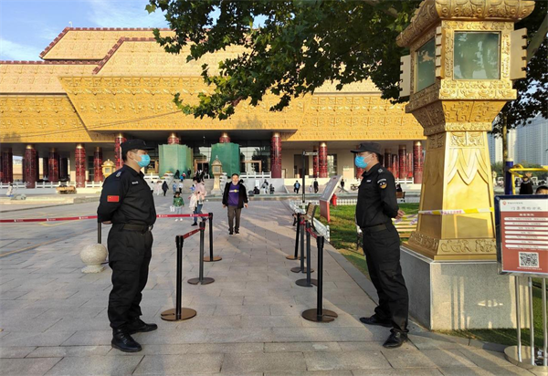 根據(jù)工作職責(zé),外圍隊員負責(zé)查驗游客佩戴口罩、場所碼、48小時核酸檢測陰性報告、電子門票預(yù)約等。女子班隊員負責(zé)安檢,提醒游客有序掃碼掃票,并進行危險物品檢查。各展廳隊員在崗在位,維護參觀秩序。大家不畏辛苦,堅守崗位履職盡責(zé),國慶期間共接待游客約2萬人次,平均每日3000人次,圓滿完成各項安保任務(wù)。