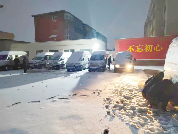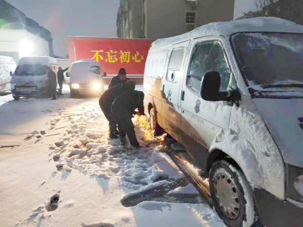 命令下達(dá),隊(duì)員們紛紛出動(dòng),冒著嚴(yán)寒、頂著大雪,小心翼翼的趕到大隊(duì),進(jìn)行出車前的準(zhǔn)備工作。隊(duì)員們配合默契、行動(dòng)迅速,司機(jī)在大隊(duì)領(lǐng)導(dǎo)的帶領(lǐng)下給押運(yùn)車輛安裝防滑鏈;隊(duì)員在車長(zhǎng)的指揮下拿起鐵鍬,鏟除積雪;還有一些隊(duì)員在清理駐地路面,撒上化雪鹽,確保正常出車。
