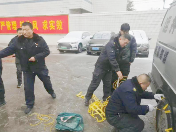 上午收車回來后,楊中朝立即督促各車組人員及時檢查防滑鏈,詢問押運途中的工作路況信息,并對車長司機提出要求,一是要注意特殊路段的道路情況,所有車組至少配齊兩套防滑鏈,避免防滑鏈斷裂,偏遠線路要攜帶三條防滑鏈;二是要減速慢行,不要強行超車,勻速30-40公里行駛,車長要密切配合司機觀察路況;三是要用對講機與大隊保持聯(lián)系,及時與客戶溝通,取消偏遠網點的款箱運送,調整下午點名時間,提前出車,不惜一切代價堅決打贏這次低溫冰雪天氣攻堅戰(zhàn)。