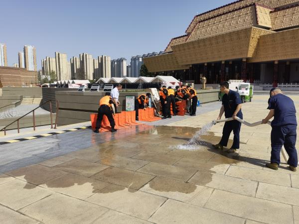 活動中,隨著預(yù)警信號響起,由特保隊員組成的防汛應(yīng)急小組聞令而動,迅速集結(jié),按照預(yù)案分組開展“防汛”救災(zāi)工作?!皳岆U作戰(zhàn)組”立即調(diào)取抽水泵架設(shè)到位、及時排澇,防汛沙袋逐一封堵庫房等重點部位;“安全疏散小組衛(wèi)組”有序組織游客和職工疏散。各組分工明確、配合得力,演練現(xiàn)場緊張有序、過程持續(xù)半個多小時,達到了預(yù)期目標。
