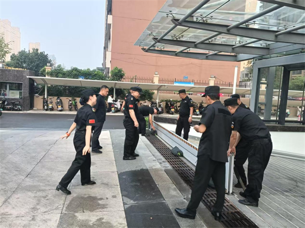 此次演練模擬了暴雨導(dǎo)致雨水倒灌、地下停車場(chǎng)積水等險(xiǎn)情。全體隊(duì)員迅速響應(yīng),按照預(yù)案分工協(xié)作,保安隊(duì)員第一時(shí)放置擋水板和堆砌沙袋,并將重要物資轉(zhuǎn)移安全。