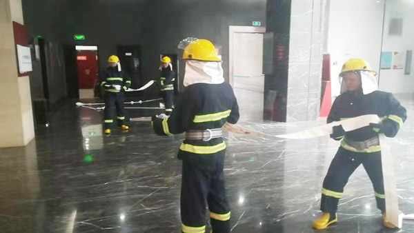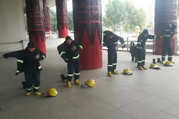 中隊隊員在每日消防訓練前,在中隊長的帶領下認真學習消防安全知識,滅火器和消火栓等消防器材的使用方法,以及火災發(fā)生時的應急措施。中隊理論與實踐相結(jié)合,提高隊員的實際處置火險能力,組織隊員開展初起火災的撲救、自我安全保護、組織人員疏散、消防設施和器材的操作等訓練。訓練中,特保隊員發(fā)現(xiàn)火情后,立即啟動火災應急處置方案,有的隊員迅速穿上消防服裝,觀察樓層火情,隔離起火設備,有的連接消防栓,打開滅火器撲滅火險。