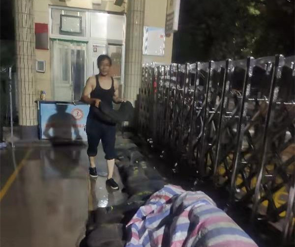 零點五十分,雨勢突然變大,短短十幾分鐘的雨量,已經把學校門口的慢車道全部淹沒,積水馬上就要涌入校園。雨情就是警情,汛情就是命令。防汛排險,刻不容緩。何濤立刻打上雨傘,開始用防汛沙袋封堵大門,由于雨下的很急,雨傘多次被打落,他直接把雨傘扔到一邊,雙手搬起了沙袋,很快便壘起了一面沙墻,及時將雨水堵在校門之外。