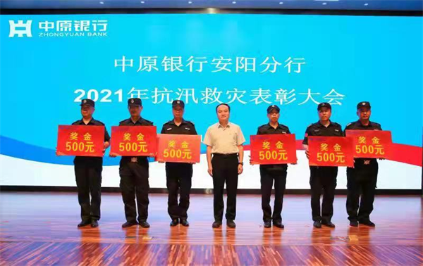 2021年9月23日,中原銀行安陽(yáng)分行在三樓報(bào)告廳隆重召開(kāi)先進(jìn)表彰大會(huì),分行領(lǐng)導(dǎo)班子、各支行行長(zhǎng)和部門(mén)經(jīng)理全部參加,會(huì)議由分行紀(jì)委書(shū)記牛書(shū)記主持,表彰在“7.22”防汛救災(zāi)中表現(xiàn)突出的先進(jìn)集體和個(gè)人,大會(huì)表?yè)P(yáng)了安陽(yáng)市洹河保安服務(wù)公司駐分行人防四大隊(duì)保安中隊(duì)長(zhǎng)田衛(wèi)順、郭海波等6位先進(jìn)個(gè)人,并每人發(fā)放獎(jiǎng)金500元。表?yè)P(yáng)他們?cè)诖鬄?zāi)面前“困難時(shí)刻拉得出,危急時(shí)刻頂?shù)蒙?,關(guān)鍵時(shí)刻靠得住,決戰(zhàn)時(shí)刻打得贏”的防汛救災(zāi)精神。