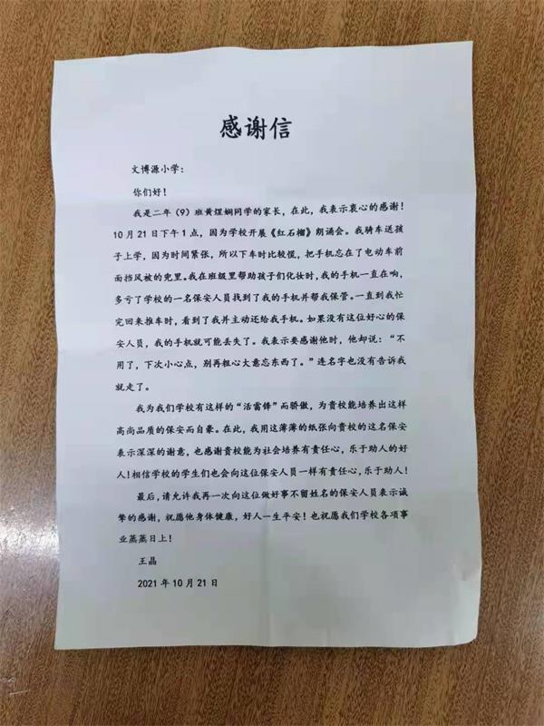 10 月21 日下午1點(diǎn),該校二年級(9)班黃煜嫻的家長王晶帶孩子來校參加《紅石榴》朗誦會?;琶χ?,下車時不慎把手機(jī)忘在了電動車前面擋風(fēng)被的兜里,便匆匆進(jìn)了學(xué)校。因忙于幫助孩子們化妝,王晶根本想不起手機(jī)的事。后來她的手機(jī)一直在響,正在門口執(zhí)勤的保安員趙海利循聲找到手機(jī),便幫她保管了起來。待王晶忙完回來推車時,趙海利主動把手機(jī)交給了她。因為大門外人行道過往的人很多,要不是這名保安給她把手機(jī)保管起來,肯定是找不回來了。王晶驚喜之余,表示要感謝他時,趙海利善意提醒道:“不用了,下次小心點(diǎn),別再粗心大意忘東西了?!闭f完便忙他的去了。