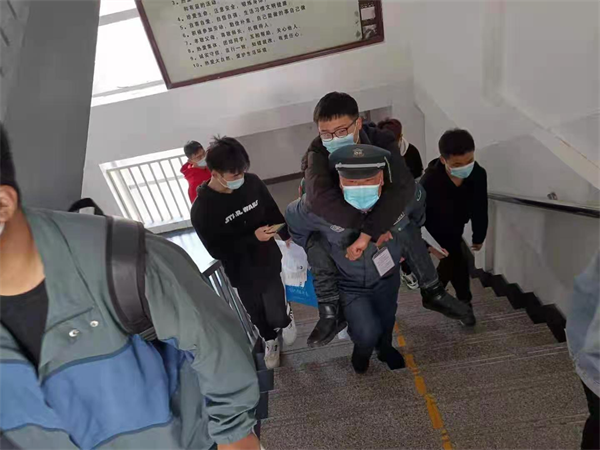 10月30日上午9點,在安陽市第八中學教師資格證考試入場前,看到一位校園保安將一名考生從一樓背上四樓,在場的考生、監(jiān)考老師對這位校園保安的舉動嘖嘖稱贊。