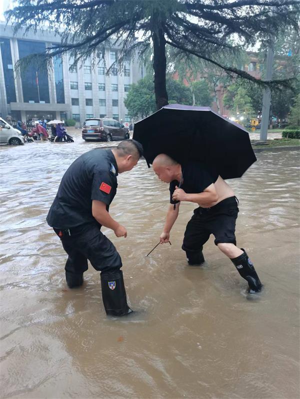 7月5日下午,安陽區(qū)域突遭暴雨襲擊 ,城市道路內(nèi)澇嚴重,人防一大隊駐中國銀行保安班全力以赴確??蛻魡挝婚T前道路暢通。