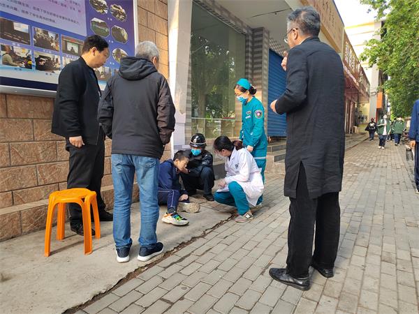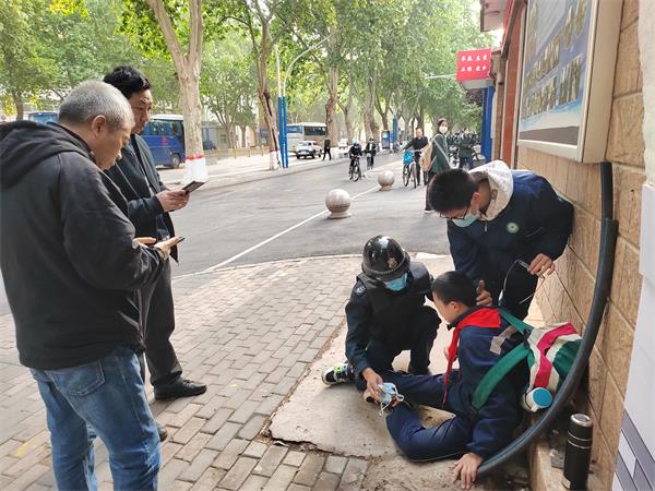 當(dāng)天早上6:58分,正值上學(xué)早高峰,閆永勝、張健正在市二十中學(xué)門口維持入學(xué)秩序,突然看到一名七年級學(xué)生在校門西側(cè)摔倒,另一名學(xué)生迅速攙扶,隨即與該校值班人員上前查看,只見摔倒學(xué)生手捂腹部,面色蒼白、且有虛汗,不宜貿(mào)然挪動。見此情形,他們立即撥打120急救電話,并通知其班主任和家長。期間,張健和另一位送孩子上學(xué)的家長拿出甜面包和糖喂食。120急救車到來后,學(xué)校值班人員隨車前往醫(yī)院,班主任及家長幾分鐘后也迅速趕往醫(yī)院。急救車離開后,張健將學(xué)生書包、自行車等物品放置門崗?fù)咨票9堋?