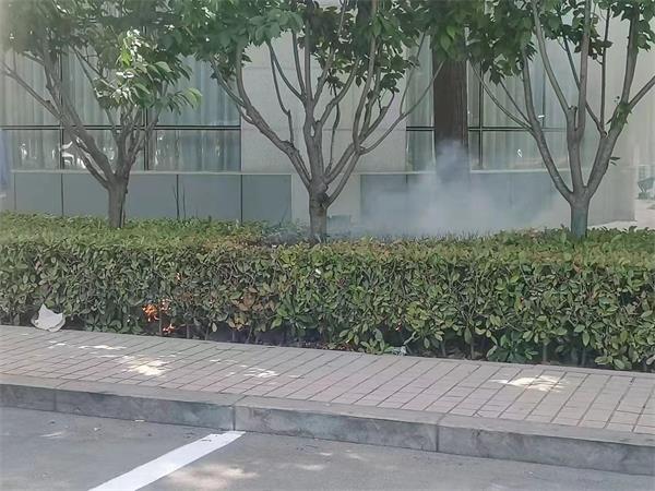 5月1日下午13點45分許,黨政大樓隊員苗沖沖巡邏到餐廳時發(fā)現(xiàn)綠化冒起濃煙,并冒起火苗,苗沖沖立即用對講報告班長趙彬彬。趙彬彬在接到火情后,迅速操起兩個滅火器趕到現(xiàn)場,和苗沖沖一起把火撲滅,避免了珍貴樹種被燒死和草坪被大面積燒毀。據(jù)分析,火情是由于抽煙者未掐滅而隨手丟棄煙頭引起的。