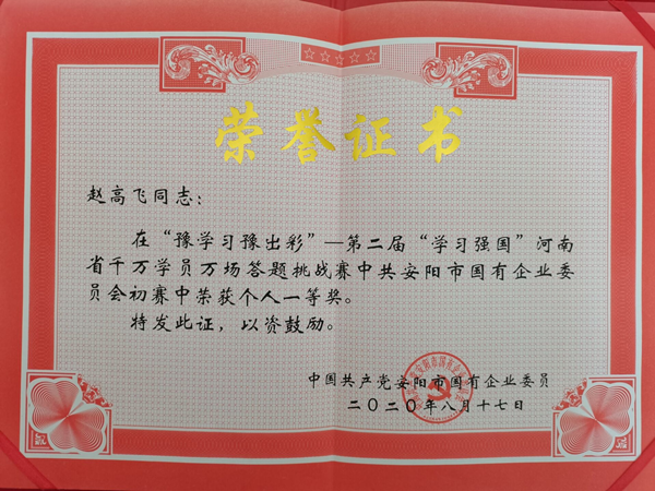 對(duì)于平時(shí)怎樣學(xué)習(xí),趙高飛有自己的學(xué)習(xí)心得,他認(rèn)為,學(xué)習(xí)要貴在勤奮、貴在鉆研、貴在有恒,每天早上第一件事,就是打開學(xué)習(xí)強(qiáng)國(guó)平臺(tái),翻閱感興趣的時(shí)事新聞和行業(yè)動(dòng)態(tài),完成每天的學(xué)習(xí)任務(wù),從不占用工作時(shí)間學(xué)習(xí),都是在上班之前就完成了。對(duì)于參加比賽如何獲得好的成績(jī),趙高飛有一套自己的學(xué)習(xí)竅門。一是要堅(jiān)持,每天堅(jiān)持把當(dāng)日學(xué)習(xí)積分做完,總結(jié)學(xué)習(xí)方法和學(xué)習(xí)技巧。二是勤練習(xí),四人賽、雙人對(duì)戰(zhàn)是關(guān)鍵,要勤練習(xí)各個(gè)答題模塊,熟能生巧。三是有訣竅,他整理出一整套學(xué)習(xí)題庫(kù)達(dá)5000多題,并利用碎片時(shí)間翻看熟記于心,他把各種類型的題分類總結(jié),錯(cuò)題、易錯(cuò)題收藏起來,反復(fù)練習(xí)、各個(gè)擊破,最終,他克服一切困難,集中一切精力用5個(gè)小時(shí)時(shí)間,通關(guān)“強(qiáng)國(guó)總題庫(kù)”共4202題。四是重交流,他加入了“學(xué)習(xí)強(qiáng)國(guó)”全國(guó)學(xué)習(xí)聯(lián)盟、“學(xué)習(xí)強(qiáng)國(guó)”河南學(xué)習(xí)聯(lián)盟等學(xué)習(xí)微信群,和學(xué)習(xí)達(dá)人們一起探討答題經(jīng)驗(yàn)和技巧