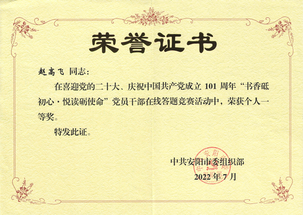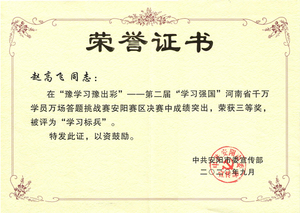 趙高飛,35歲,中共黨員,本科學(xué)歷,現(xiàn)任鼎信子公司副經(jīng)理,自“學(xué)習(xí)強(qiáng)國(guó)”平臺(tái)上線以來,趙高飛學(xué)習(xí)成績(jī)屢創(chuàng)新高,先后榮獲2020年度學(xué)習(xí)強(qiáng)國(guó)挑戰(zhàn)賽安陽(yáng)市賽區(qū)決賽“個(gè)人三等獎(jiǎng)”,2021年度安陽(yáng)市黨員干部在線答題競(jìng)賽“個(gè)人三等獎(jiǎng)”,2022年度學(xué)習(xí)強(qiáng)國(guó)河南學(xué)習(xí)平臺(tái)“喜迎二十大、中原更出彩”答題比賽“周達(dá)人”及“學(xué)習(xí)達(dá)人”,2023年度“強(qiáng)國(guó)有我 學(xué)習(xí)興安”學(xué)習(xí)強(qiáng)國(guó)答題挑戰(zhàn)賽安陽(yáng)市決賽“個(gè)人二等獎(jiǎng)”,2023年度學(xué)習(xí)強(qiáng)國(guó)河南學(xué)習(xí)平臺(tái)“貫徹二十大精神、建設(shè)現(xiàn)代化河南”強(qiáng)國(guó)答題比賽“周達(dá)人”。學(xué)習(xí)從來都不是一蹴而就的,這些成績(jī)的獲得,是趙高飛日積月累堅(jiān)持學(xué)習(xí)的成果。