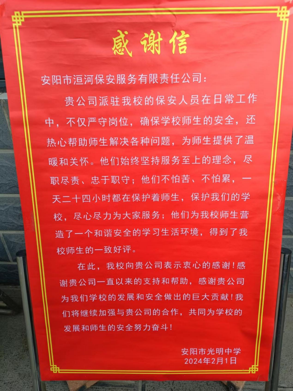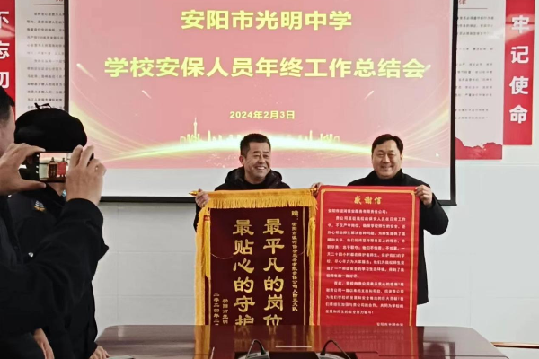 2024年2月3日,在安陽市光明中學(xué)年終工作總結(jié)會(huì)上,學(xué)校領(lǐng)導(dǎo)將一面印有“最平凡的崗位、最貼心的守護(hù)”的錦旗送到人防三大隊(duì)副大隊(duì)長劉慶剛手中,并致信表揚(yáng),感謝人防三大隊(duì)駐安陽市光明中學(xué)保安班對(duì)維護(hù)校園安全以及校園周邊治安秩序做出的積極努力和貢獻(xiàn)。