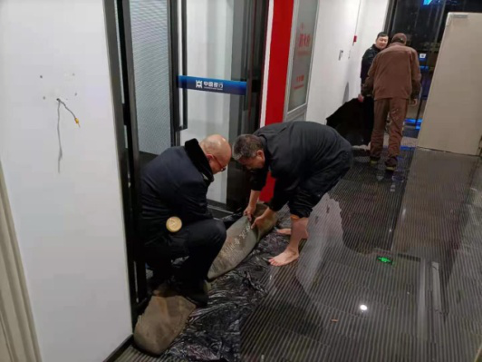 看到水還在通過破裂的管道不斷涌出,辦公室和走廊已經(jīng)有了積水,已經(jīng)危及到辦公用品的安全。值班隊(duì)員不顧寒冷,立即行動起來,與中原銀行物業(yè)人員投入搶險。隊(duì)員趙紅、王勇一方面把已經(jīng)有積水的辦公室中的物品搬運(yùn)出來,另一方面迅速用沙袋擋在辦公室門口,阻止流水進(jìn)入,并用掃把等工具清理積水;趙紅更是脫掉鞋,光著腳,泡在寒冷刺骨的水中,清理積水,減少損失。物業(yè)人員則從管道破裂處,接上臨時管道把水引向樓外。經(jīng)過一個小時的奮戰(zhàn),辦公室和樓道內(nèi)的積水終被清理完畢。