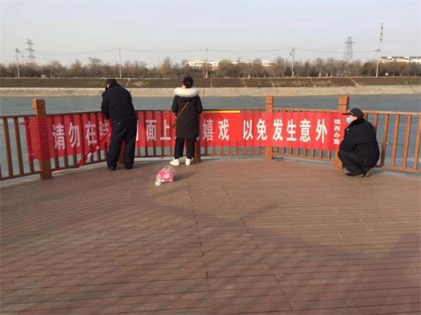 1月12日下午4點(diǎn),群眾在洹河岸邊看到幾名保安員在安陽市洹河邊懸掛“請(qǐng)勿在結(jié)冰水面上運(yùn)動(dòng)嬉戲以免發(fā)生意外”宣傳條幅,并向群眾宣傳切勿走進(jìn)河邊,發(fā)生危險(xiǎn)。原來,由于近期氣溫連創(chuàng)新低,溫度一直在零下10度左右,安陽河也一度結(jié)冰,巡防隊(duì)員在巡邏市發(fā)現(xiàn)有不少群眾和兒童在河冰上嬉鬧,經(jīng)多次勸阻無效,為減少事故隱患,巡防隊(duì)員向鐵西路辦事處請(qǐng)示后特在安陽河顯著位置懸掛條幅,提醒群眾兒童不要在冰面上嬉戲玩耍,避免意外事故發(fā)生。