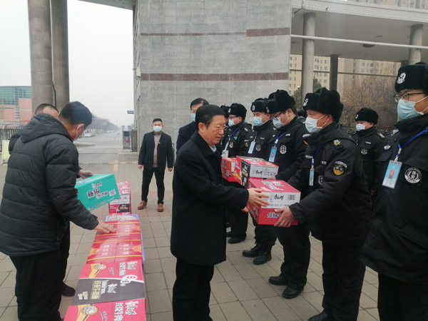1月15日上午,安陽工學(xué)院校長景國勛一行,帶著方便面、蘋果、橘子等慰問品,來到人防三大隊派駐工學(xué)院保安班駐地慰問堅守在一線執(zhí)勤的隊員。人防三大隊領(lǐng)導(dǎo)王武魁、聶紹軍、閆永勝參加了慰問活動。