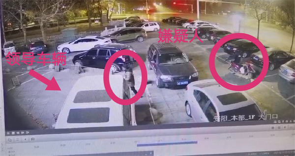 圖為發(fā)現(xiàn)可疑人員,一人圍繞銀行領導車輛查看,一人騎摩托車放風(視頻截圖)