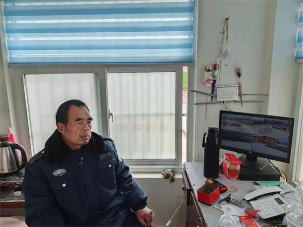圖為招賢小學(xué)保安徐寶堂在門崗邊值班邊輸液。
