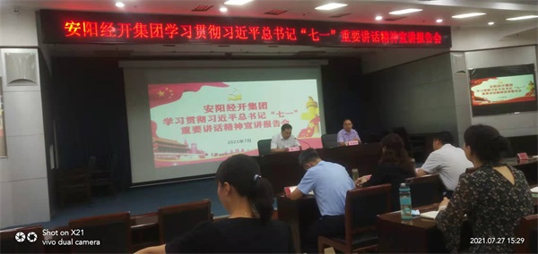 2021年7月27日下午,安陽市洹河保安公司黨委組織10名黨員干部,參加了由中共安陽經(jīng)開集團(tuán)黨委舉辦的學(xué)習(xí)貫徹習(xí)近平總書記“七一”重要講話精神宣講報告會,會議邀請河南護(hù)理職業(yè)學(xué)院馬克思主義學(xué)院副院長、副教授張艷林主講,會議由經(jīng)開集團(tuán)黨委書記、董事長齊方同志主持。